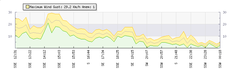 In the last few minutes the wind was South South East at an average speed of 7 kmh, reaching up to 11 kmh and a low of 4 kmh. The gust strength is7 kmh above the minimum speed |