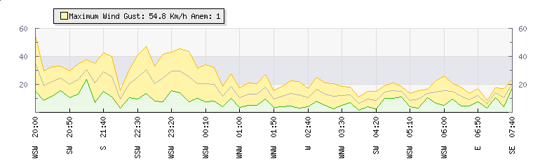 In the last few minutes the wind was West South West at an average speed of 11 kmh, reaching up to 18 kmh and a low of 5 kmh. The gust strength is13 kmh above the minimum speed |