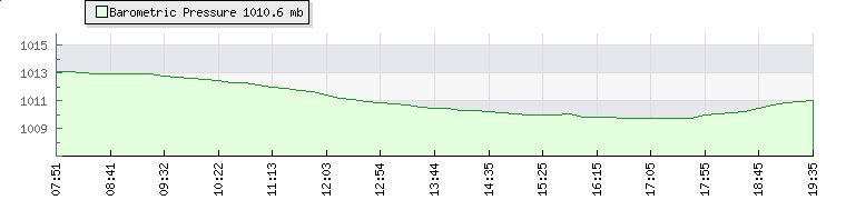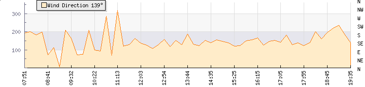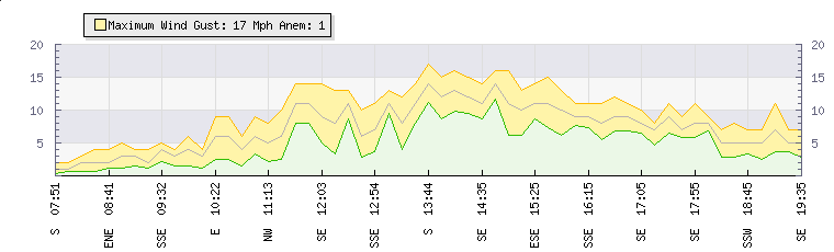 In the last few minutes the wind was South Easterly at an average speed of 7 mph, reaching up to 9 mph and a low of 6 mph. The gust strength is3 mph above the minimum speed |