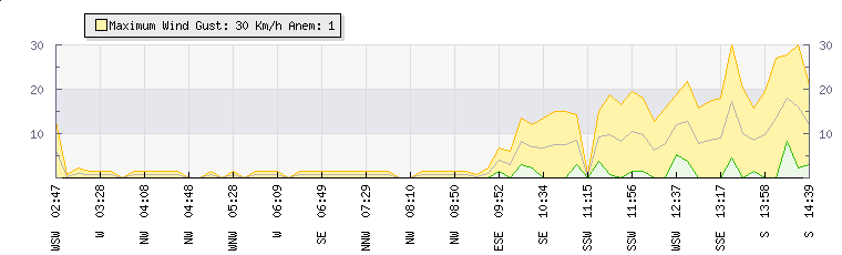 In the last few minutes the wind was Southerly at an average speed of 9 kmh, reaching up to 17 kmh and a low of 0 kmh. The gust strength is17 kmh above the minimum speed |