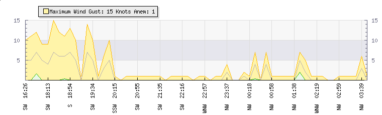 In the last few minutes the wind was North Westerly at an average speed of 1 knots, reaching up to 1 knots and a low of 0 knots. The gust strength is1 knots above the minimum speed |