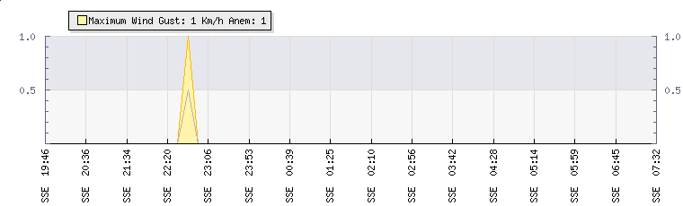 In the last few minutes the wind was South South East at an average speed of 0 kmh, reaching up to 0 kmh and a low of 0 kmh. The gust strength is0 kmh above the minimum speed |