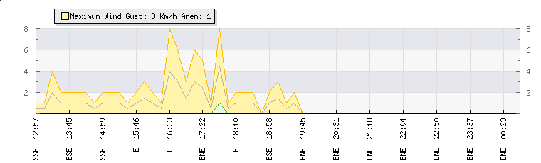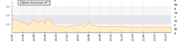 In the last few minutes the wind was East North East at an average speed of 0 kmh, reaching up to 0 kmh and a low of 0 kmh. The gust strength is0 kmh above the minimum speed |
