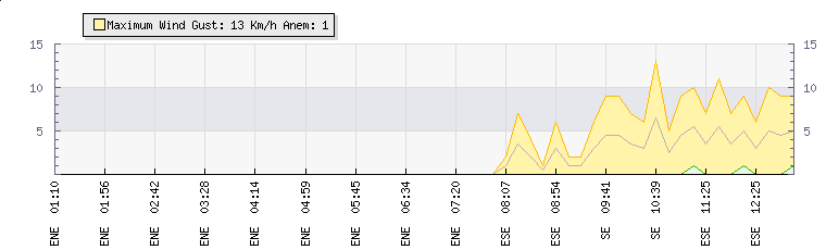 In the last few minutes the wind was East South East at an average speed of 3 kmh, reaching up to 6 kmh and a low of 0 kmh. The gust strength is6 kmh above the minimum speed |