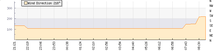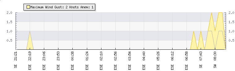 In the last few minutes the wind was East South East at an average speed of 0 knots, reaching up to 0 knots and a low of 0 knots. The gust strength is0 knots above the minimum speed |