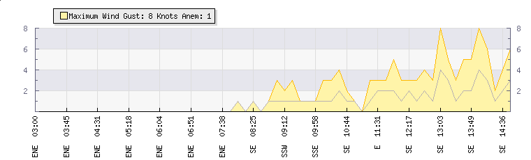 In the last few minutes the wind was South Easterly at an average speed of 4 knots, reaching up to 8 knots and a low of 0 knots. The gust strength is8 knots above the minimum speed |