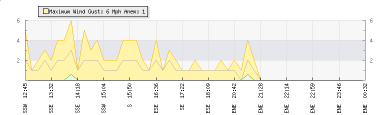 In the last few minutes the wind was North North East at an average speed of 1 mph, reaching up to 2 mph and a low of 0 mph. The gust strength is2 mph above the minimum speed |