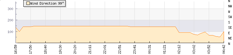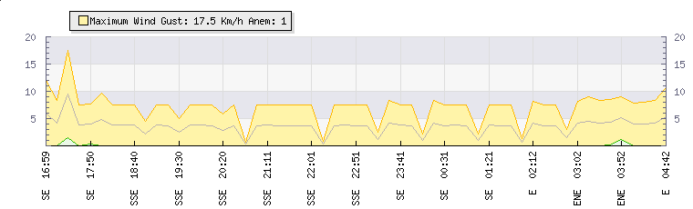 In the last few minutes the wind was East North East at an average speed of 4 kmh, reaching up to 9 kmh and a low of 0 kmh. The gust strength is9 kmh above the minimum speed |