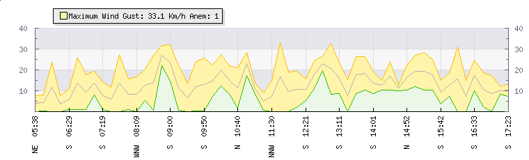 In the last few minutes the wind was Southerly at an average speed of 6 kmh, reaching up to 12 kmh and a low of 0 kmh. The gust strength is12 kmh above the minimum speed |