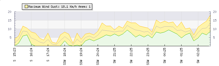In the last few minutes the wind was South Westerly at an average speed of 8 kmh, reaching up to 10 kmh and a low of 6 kmh. The gust strength is4 kmh above the minimum speed |