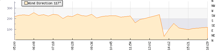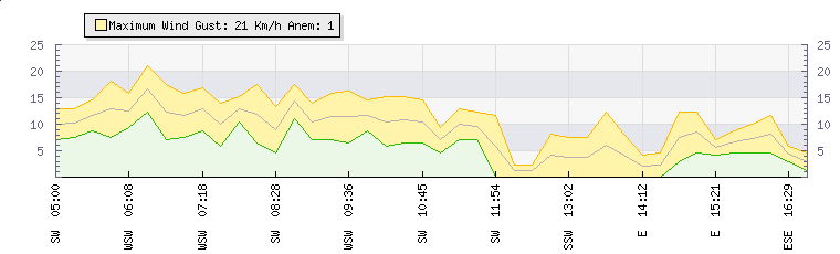In the last few minutes the wind was East South East at an average speed of 8 kmh, reaching up to 12 kmh and a low of 5 kmh. The gust strength is7 kmh above the minimum speed |