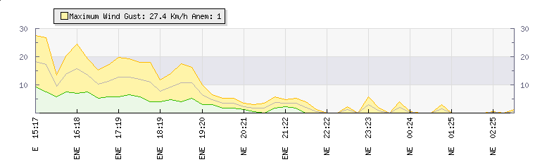 In the last few minutes the wind was North Easterly at an average speed of 0 kmh, reaching up to 0 kmh and a low of 0 kmh. The gust strength is0 kmh above the minimum speed |