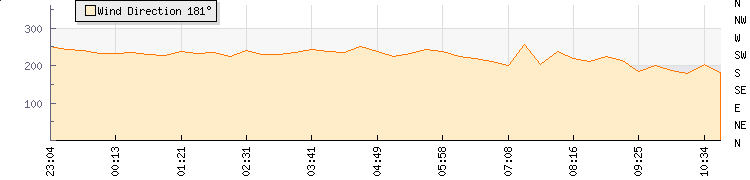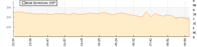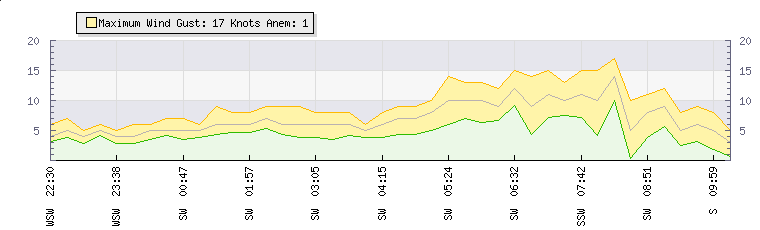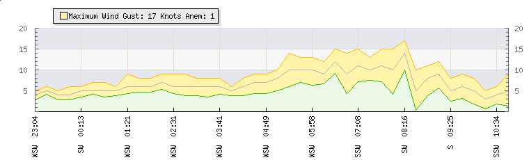 In the last few minutes the wind was South South West at an average speed of 6 knots, reaching up to 9 knots and a low of 3 knots. The gust strength is6 knots above the minimum speed |