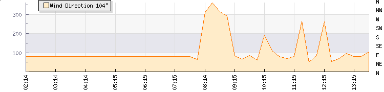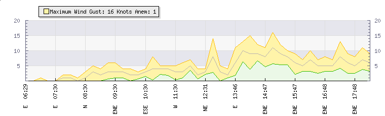 In the last few minutes the wind was North North East at an average speed of 5 knots, reaching up to 7 knots and a low of 3 knots. The gust strength is4 knots above the minimum speed |