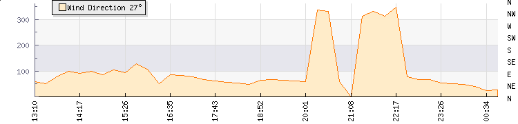 In the last few minutes the wind was East North East at an average speed of 2 mph, reaching up to 3 mph and a low of 1 mph. The gust strength is2 mph above the minimum speed |