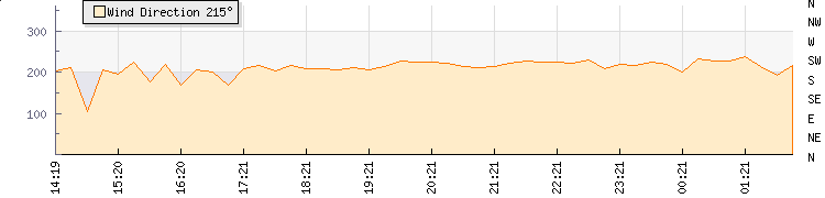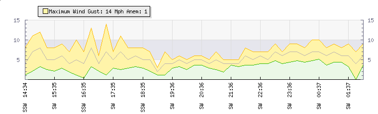 In the last few minutes the wind was South Westerly at an average speed of 6 mph, reaching up to 8 mph and a low of 4 mph. The gust strength is4 mph above the minimum speed |