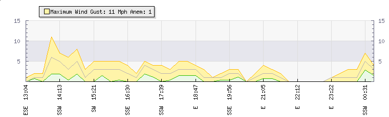 In the last few minutes the wind was South Westerly at an average speed of 12 mph, reaching up to 14 mph and a low of 9 mph. The gust strength is5 mph above the minimum speed |