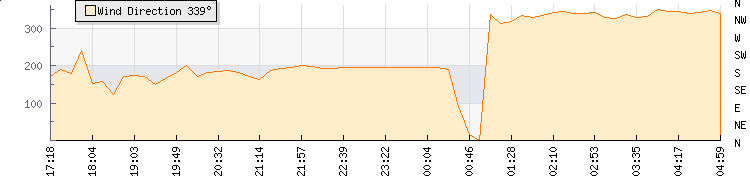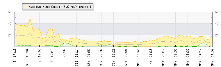 In the last few minutes the wind was North North West at an average speed of 9 kmh, reaching up to 17 kmh and a low of 1 kmh. The gust strength is16 kmh above the minimum speed |