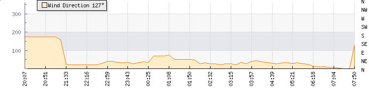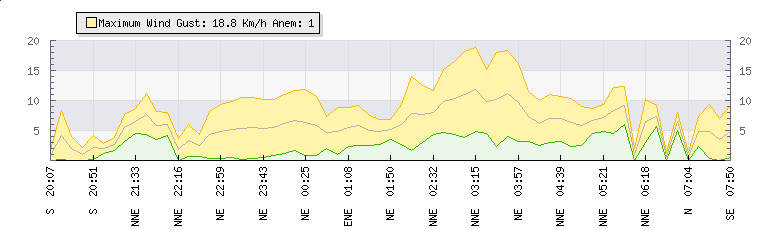 In the last few minutes the wind was North North East at an average speed of 1 kmh, reaching up to 2 kmh and a low of 0 kmh. The gust strength is2 kmh above the minimum speed |