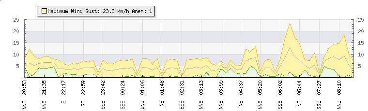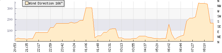 In the last few minutes the wind was Southerly at an average speed of 4 kmh, reaching up to 7 kmh and a low of 1 kmh. The gust strength is6 kmh above the minimum speed |