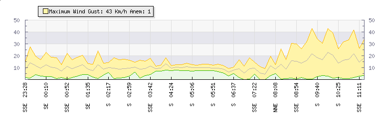 In the last few minutes the wind was East North East at an average speed of 12 kmh, reaching up to 20 kmh and a low of 4 kmh. The gust strength is16 kmh above the minimum speed |