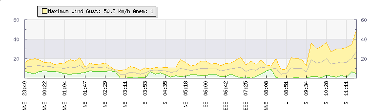 In the last few minutes the wind was South South East at an average speed of 19 kmh, reaching up to 36 kmh and a low of 2 kmh. The gust strength is34 kmh above the minimum speed |
