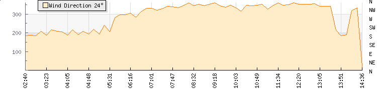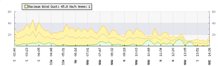 In the last few minutes the wind was North North West at an average speed of 13 kmh, reaching up to 17 kmh and a low of 8 kmh. The gust strength is9 kmh above the minimum speed |