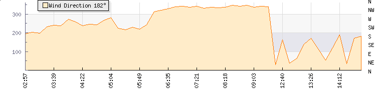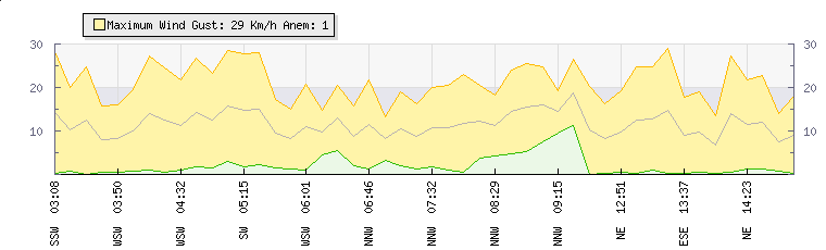 In the last few minutes the wind was East North East at an average speed of 13 kmh, reaching up to 25 kmh and a low of 0 kmh. The gust strength is25 kmh above the minimum speed |