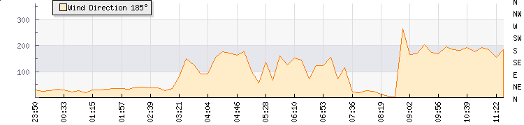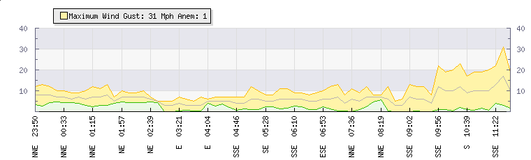 In the last few minutes the wind was South South West at an average speed of 10 mph, reaching up to 19 mph and a low of 1 mph. The gust strength is18 mph above the minimum speed |