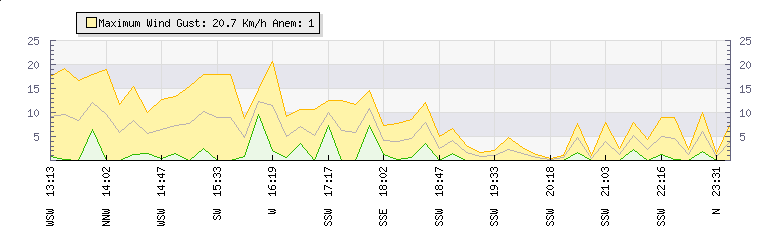 In the last few minutes the wind was Northerly at an average speed of 1 kmh, reaching up to 2 kmh and a low of 0 kmh. The gust strength is2 kmh above the minimum speed |
