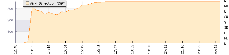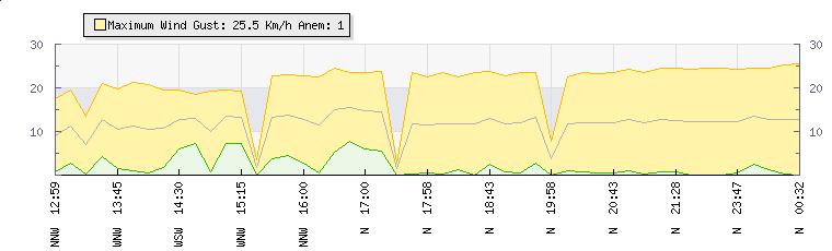 In the last few minutes the wind was Northerly at an average speed of 12 kmh, reaching up to 24 kmh and a low of 0 kmh. The gust strength is24 kmh above the minimum speed |