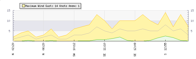 In the last few minutes the wind was South Westerly at an average speed of 4 knots, reaching up to 8 knots and a low of 0 knots. The gust strength is8 knots above the minimum speed |