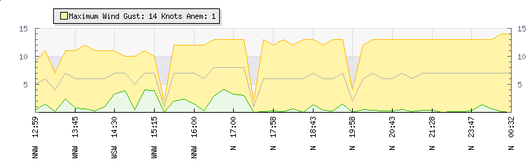 In the last few minutes the wind was Northerly at an average speed of 7 knots, reaching up to 13 knots and a low of 0 knots. The gust strength is13 knots above the minimum speed |