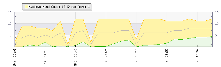 In the last few minutes the wind was Northerly at an average speed of 6 knots, reaching up to 11 knots and a low of 2 knots. The gust strength is9 knots above the minimum speed |