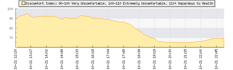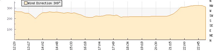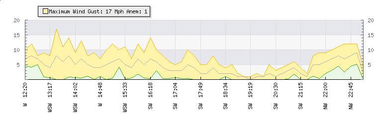 In the last few minutes the wind was West South West at an average speed of 6 mph, reaching up to 12 mph and a low of 1 mph. The gust strength is11 mph above the minimum speed |