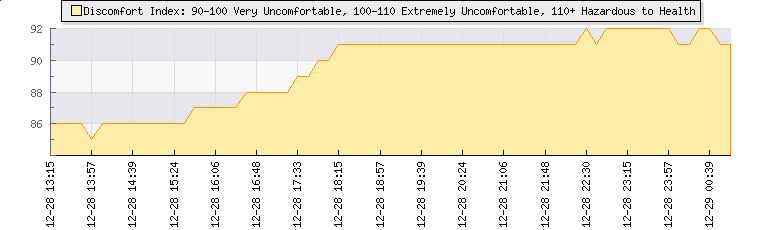 | Wind Speed: | 4|8|12 kmh | Wind Direction: | W 270° | Temperature: | 22.6°C | | Wet Bulb: | 22.4°C | Discomfort: | 91 | Humidity: | 98% | | Rainfall Today: | 0mm | 12 hrs Rainfall: | 0mm | 24 hrs Rainfall: | 0mm | | Barometer: | 691.6mb | Dew Point: | 22.3°C | Clouds AGL: | 133ft (41 m) | | Density-Alt: | 13763ft (4195 m) | Fire Danger: | |