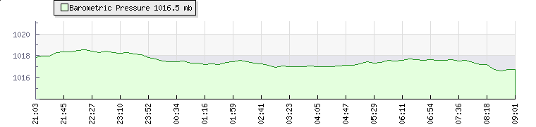 | Wind Speed: | 1|2|3 kmh | Wind Direction: | ESE 117° | Temperature: | 28.9°C | | Wet Bulb: | 22.2°C | Discomfort: | 98 | Humidity: | 55% | | Rainfall Today: | 0mm | 12 hrs Rainfall: | 0mm | 24 hrs Rainfall: | 0mm | | Barometer: | 1017mb | Dew Point: | 18.9°C | Clouds AGL: | 3986ft (1215 m) | | Density-Alt: | 1745ft (532 m) | Fire Danger: | |