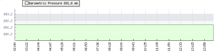| Wind Speed: | 2|4|5 kmh | Wind Direction: | NE 44° | Temperature: | 22.6°C | | Wet Bulb: | 20°C | Discomfort: | 87 | Humidity: | 80% | | Rainfall Today: | 0.3mm | 12 hrs Rainfall: | 0.3mm | 24 hrs Rainfall: | 0.3mm | | Barometer: | 691.6mb | Dew Point: | 19°C | Clouds AGL: | 1453ft (443 m) | | Density-Alt: | 13675ft (4168 m) | Fire Danger: | |
