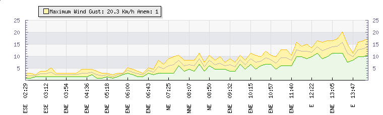 In the last few minutes the wind was North Easterly at an average speed of 4 kmh, reaching up to 5 kmh and a low of 2 kmh. The gust strength is3 kmh above the minimum speed |