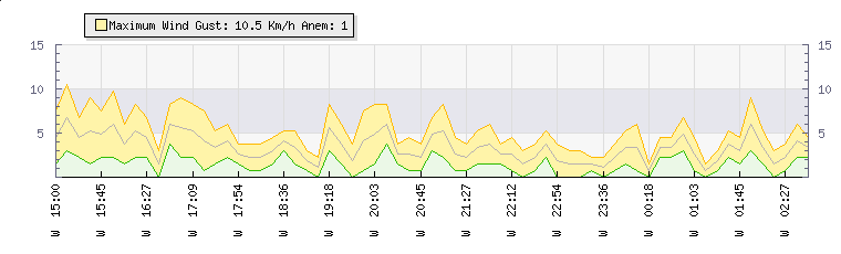 In the last few minutes the wind was Westerly at an average speed of 2 kmh, reaching up to 3 kmh and a low of 1 kmh. The gust strength is2 kmh above the minimum speed |