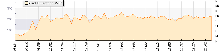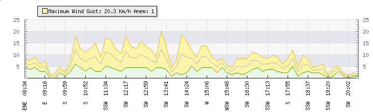 In the last few minutes the wind was South South West at an average speed of 4 kmh, reaching up to 5 kmh and a low of 3 kmh. The gust strength is2 kmh above the minimum speed |