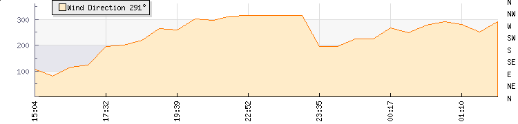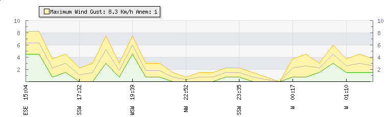 In the last few minutes the wind was South Westerly at an average speed of 0 kmh, reaching up to 0 kmh and a low of 0 kmh. The gust strength is0 kmh above the minimum speed |