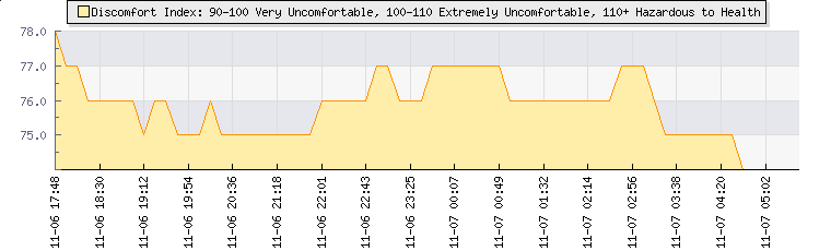 | Wind Speed: | 5|8|11 kmh | Wind Direction: | ENE 67° | Temperature: | 22.1°C | | Wet Bulb: | 19.8°C | Discomfort: | 86 | Humidity: | 82% | | Rainfall Today: | 0mm | 12 hrs Rainfall: | 0mm | 24 hrs Rainfall: | 0mm | | Barometer: | 1018.6mb | Dew Point: | 18.8°C | Clouds AGL: | 1289ft (393 m) | | Density-Alt: | 912ft (278 m) | Fire Danger: | |