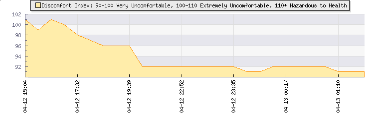| Wind Speed: | 0|0|0 kmh | Wind Direction: | SW 225° | Temperature: | 23.3°C | | Wet Bulb: | 22°C | Discomfort: | 92 | Humidity: | 90% | | Rainfall Today: | 0mm | 12 hrs Rainfall: | 0mm | 24 hrs Rainfall: | 0mm | | Barometer: | 1012.3mb | Dew Point: | 21.6°C | Clouds AGL: | 695ft (212 m) | | Density-Alt: | 1319ft (402 m) | Fire Danger: | |