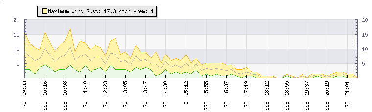 In the last few minutes the wind was South Westerly at an average speed of 7 kmh, reaching up to 11 kmh and a low of 3 kmh. The gust strength is8 kmh above the minimum speed |