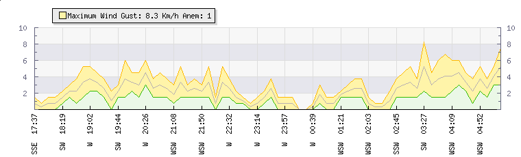 In the last few minutes the wind was East North East at an average speed of 8 kmh, reaching up to 11 kmh and a low of 5 kmh. The gust strength is6 kmh above the minimum speed |