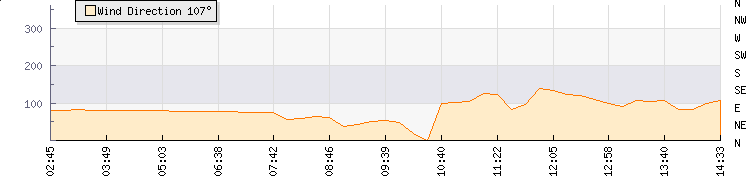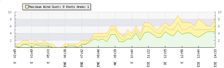 In the last few minutes the wind was East South East at an average speed of 7 knots, reaching up to 9 knots and a low of 5 knots. The gust strength is4 knots above the minimum speed |