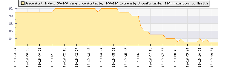 | Wind Speed: | 0|0|0 knots | Wind Direction: | SSE 149° | Temperature: | 22.6°C | | Wet Bulb: | 22.5°C | Discomfort: | 92 | Humidity: | 99% | | Rainfall Today: | 0mm | 12 hrs Rainfall: | 0.8mm | 24 hrs Rainfall: | 8.7mm | | Barometer: | 691.6mb | Dew Point: | 22.5°C | Clouds AGL: | 66ft (20 m) | | Density-Alt: | 13766ft (4196 m) | Fire Danger: | |