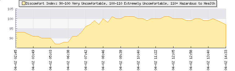 | Wind Speed: | 5|7|9 knots | Wind Direction: | ESE 110° | Temperature: | 28.4°C | | Wet Bulb: | 23.3°C | Discomfort: | 99 | Humidity: | 65% | | Rainfall Today: | 0mm | 12 hrs Rainfall: | 0mm | 24 hrs Rainfall: | 0mm | | Barometer: | 1021.1mb | Dew Point: | 21.1°C | Clouds AGL: | 2890ft (881 m) | | Density-Alt: | 1585ft (483 m) | Fire Danger: | |
