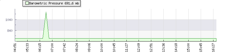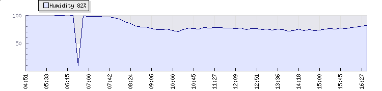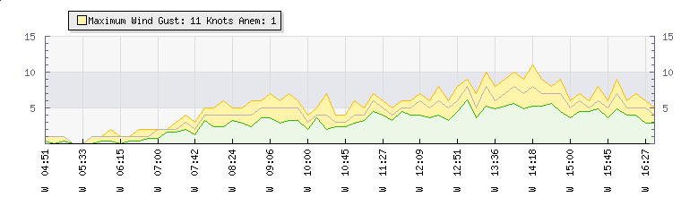 | Wind Gust: | 11 knots | Min Temp: | -143.9 °C | Max Temp: | 22.6 °C | | Wind Average: | 8 knots | Min Hum: | 10 % | Max Hum: | 100 % | |  |